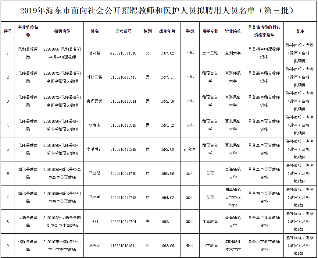 各位考生:根据《青海省事业单位公开招聘工作人员办法》和《2019年海东市面向社会公开招聘教师和医护人员公告》规定,2019年海东市公开招聘教师和医护人员递补体检及考察(政审)工作已结束,现将杜林瑞等15名考生的体检结果及政审情况进行公示,公示期为2019年10月14日至10月20日。公示期间,如对拟聘用人员有异议,请以来电或书面形式反映,反映情况时应署真实姓名和联系方式,匿名反映不予受理。公示期满后,请拟聘用人员于10月21日上午10:00前(持本人身份证、近期免冠蓝底小二寸照片3张)到报考岗位所在地教育局报到并办理聘用手续。考生注意:公示期间,若主动放弃聘用资格,请及时与我局联系并提交放弃证明。公示期满后,不得延迟报到或无正当理由逾期不报到。逾期不报到者,按自动放弃处理,记入个人诚信档案,将影响今后参加全省事业单位公开招聘。监督电话:0972-8612947 附:2019年海东市面向社会公开招聘教师和医护人员拟聘用人员名单(第三批) 海东市人力资源和社会保障局2019年10月14日