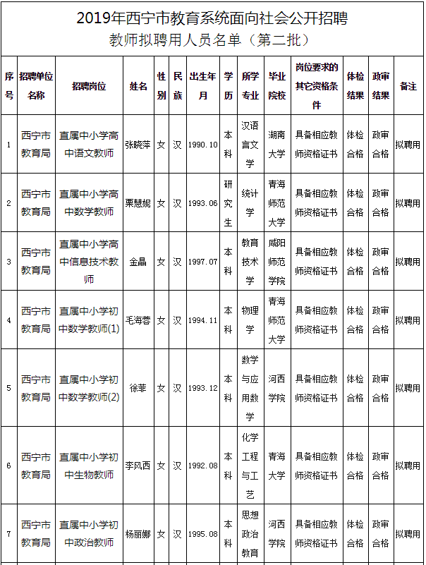 各位考生:根据《青海省事业单位公开招聘工作人员办法》(青人社厅发[2015]80号)和《2019年西宁市教育系统面向社会公开招聘教师公告》规定,2019年西宁市教育系统面向社会公开招聘教师递补考生体检、考察(政审)工作已结束,现将张晓萍等14名拟聘用人员进行公示,公示期为2019年10月17日至10月23日。公示期间,如对拟聘用人员有异议,请以来电或书面形式反映,反映情况时应署真实姓名和联系方式,匿名反映不予受理。公示期满后,请拟聘用人员持本人身份证于10月24日上班时间前往市教育局或县区人社局报到。监督电话:0971—5132943 传真:0971—5130711来信地址:西宁市人力资源和社会保障局(西宁市城北区柴达木路1号) 附件:2019年西宁市教育系统面向社会公开招聘教师拟聘用人员名单(第二批) 西宁市人力资源和社会保障局2019年10月17日