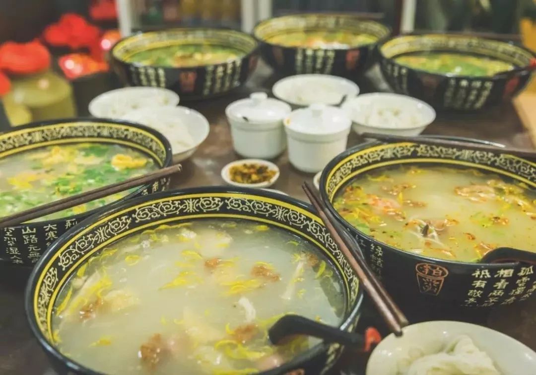 当上桌后将烫过的米线和所有佐料放进汤里后