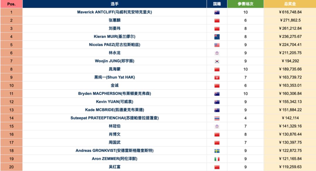 至此,海南公开赛落下帷幕。中国巡回赛的奖金榜也发生了不小的变化,新奖金榜排名如下:
