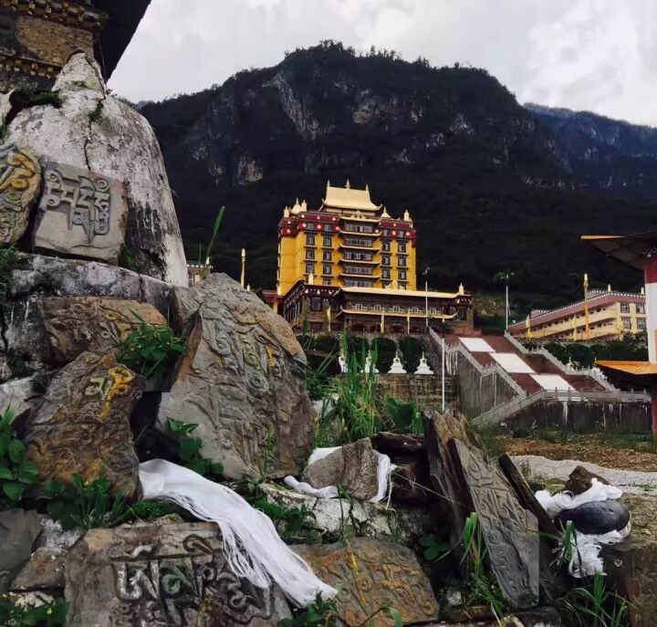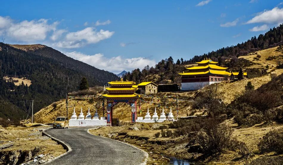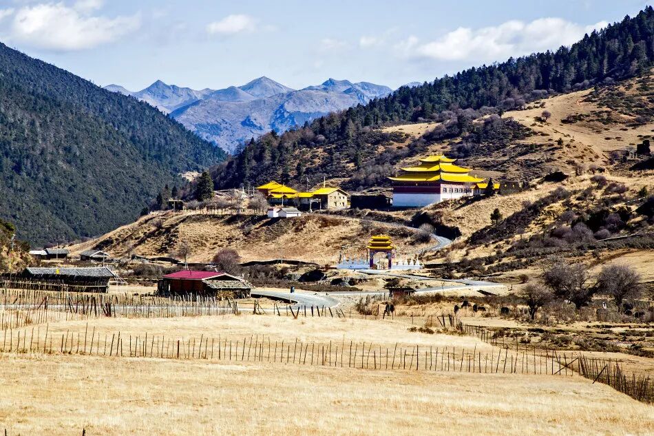 康坞大寺 为地处高原牧区,寺院坐落在两条山溪水之间雄鹰落地般的山坡山。四周有茂密的原始森林,古木遮天蔽日。高高的雪峰,仿佛是白银的佛塔,伸枝展叶,进林望不见天;百花盛开的草原上,涓涓清流从草坡里,从树丛中溢出,汇而成溪,碧光粼粼,如玉带缠绕,