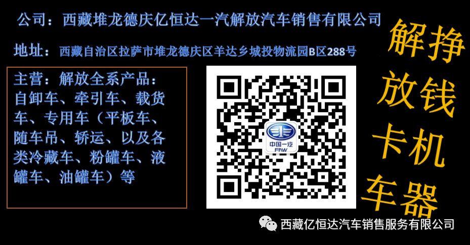 西藏亿恒达汽车销售服务有限公司是一汽解放唯一授权西藏的全品系核心经销商,产品齐全,售后有保证,购车选择西藏亿恒达是您选择挣钱机器的最佳解决方案!现在优惠巨大,而且拥有超低超灵活的金融方案支持!各位看官不要错过这个捡漏的机会哦!