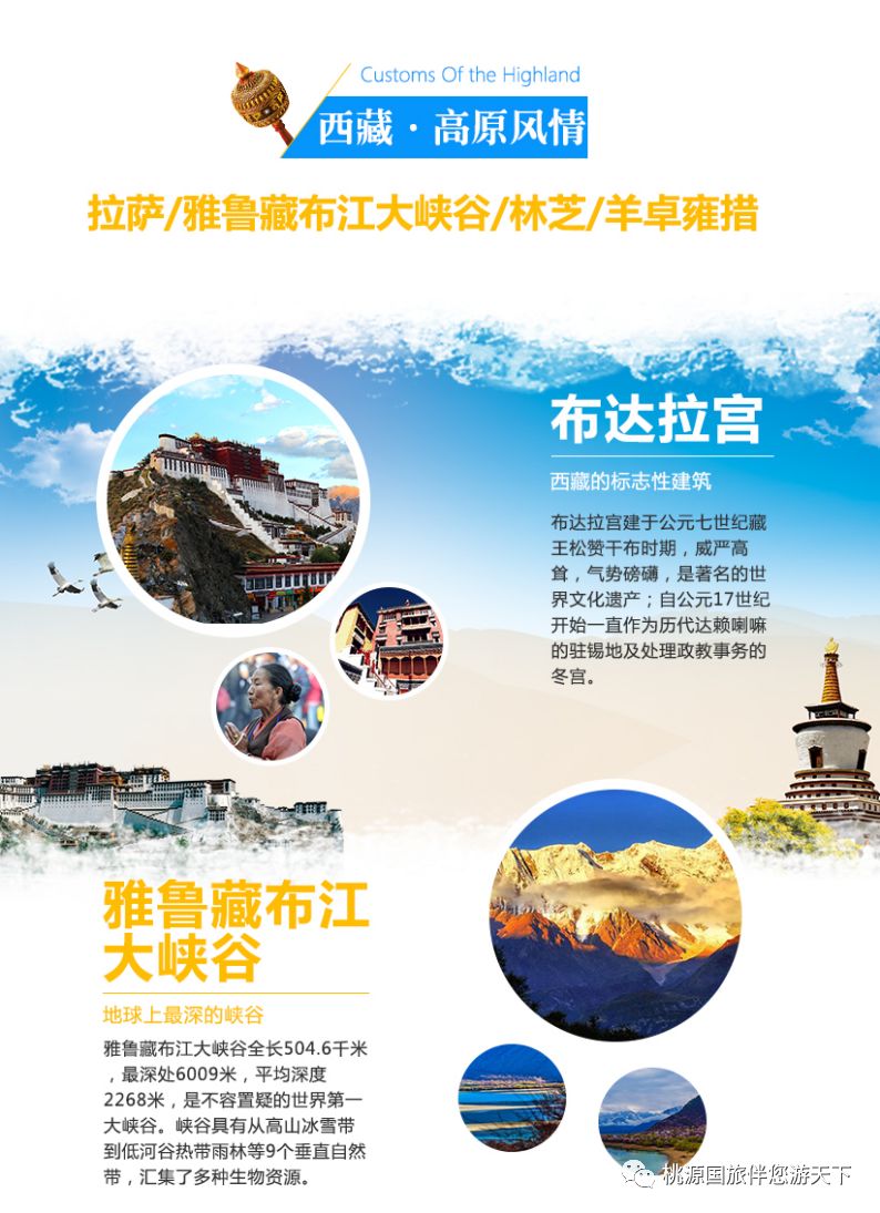 布达拉宫、大昭寺、卡定沟、苯日神山、雅鲁藏布大峡谷、羊卓雍错;