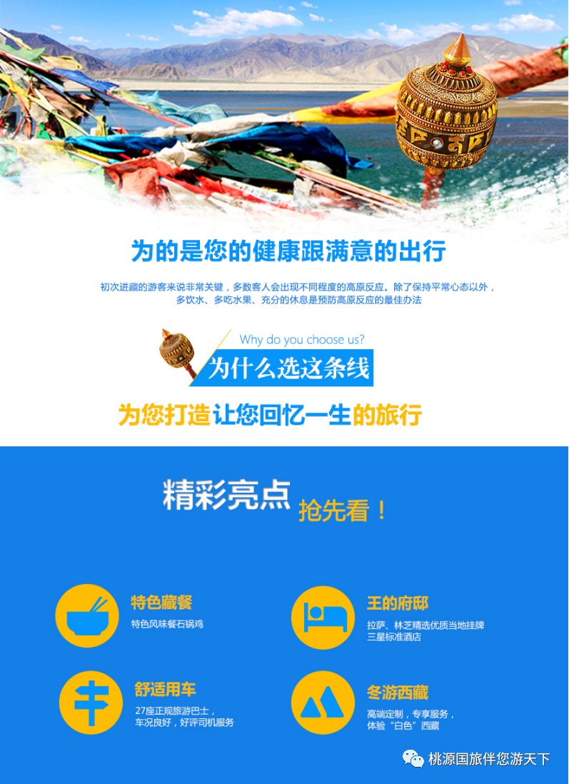 【行程提示】1、此日户外停留时间较长,请准备太阳帽,墨镜,防晒霜及饮用水。 2、地摊假冒伪劣商品较多,购买工艺品的时候请谨慎,以免上当受骗。 3、西藏特色会《文成公主》值得欣赏,若需前往观看,请自行向导游报名(380 元/人起)