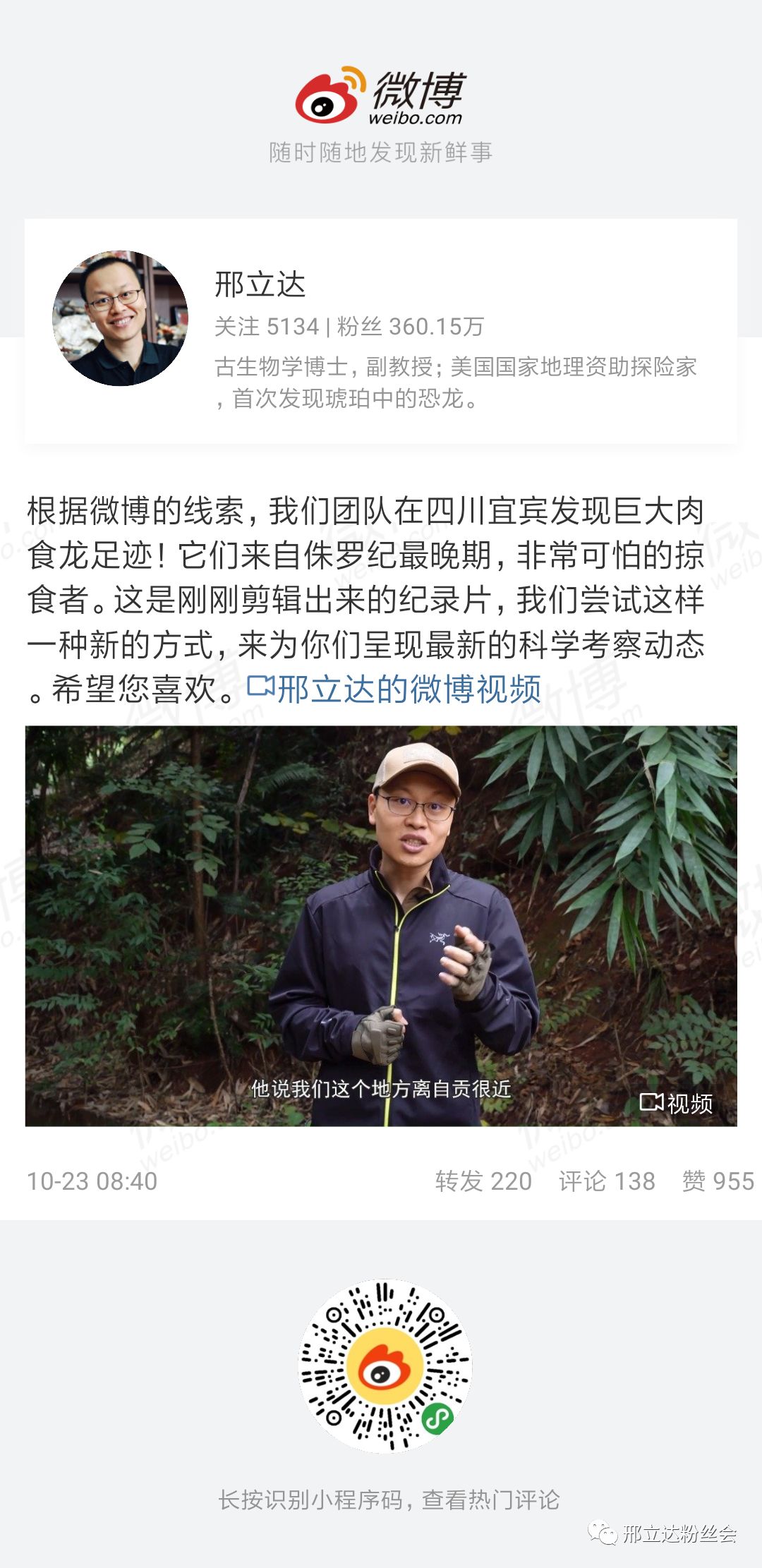 根据微博的线索,我们团队在四川宜宾发现巨大肉食龙足迹!它们来自侏罗纪最晚期,非常可怕的掠食者。这是刚刚剪辑出来的纪录片,我们尝试这样一种新的方式,来为你们呈现最新的科学考察动态。希望您喜欢。
