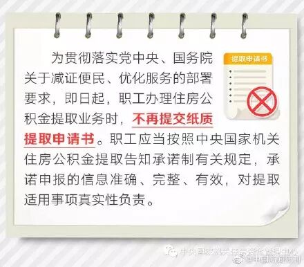 23日下午,中央国家机关住房资金管理中心微信号发布,关于简化住房公积金提取业务申请材料的公告。公告提出,即日起,职工办理住房公积金提取业务时,不再提交纸质提取申请书。