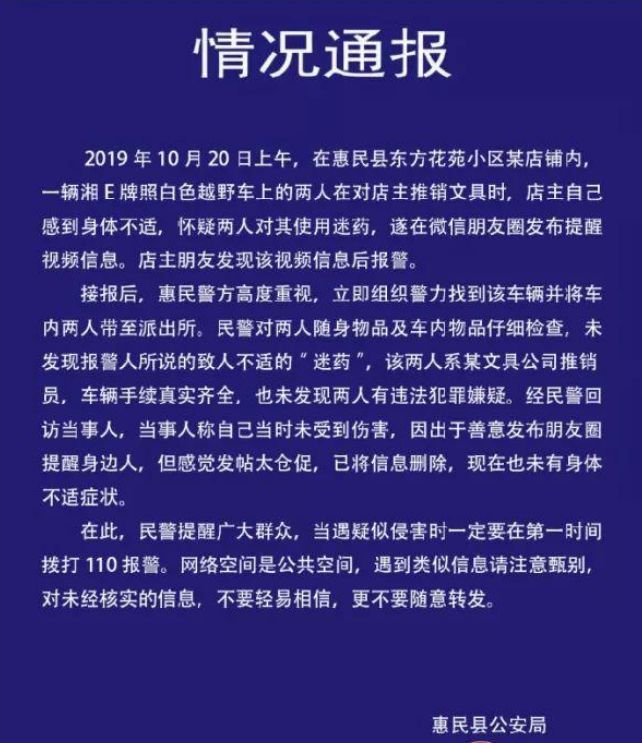 近日,山东惠民一则“我今天差点被迷药迷住”的消息在网络上迅速传播。该消息为某小区快递网点女店主发帖,称有一对开外地车的男女上门推销笔记本,自己差点被他们下药迷晕。警方调查通报表示,涉事车上未发现迷药,两人系文具推销员,手续齐全,是女店主自己感觉身体不适。
