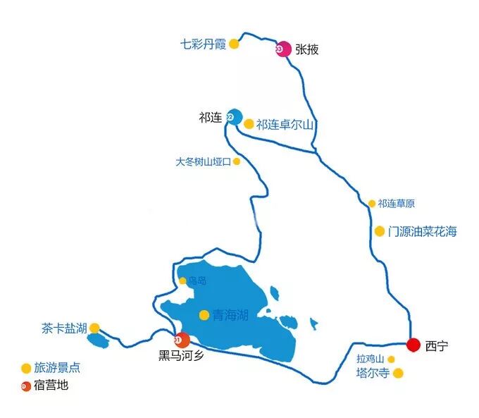青海小环线3日游 第一天: 西宁—塔尔寺—拉鸡山—青海湖—黑马河(宿黑马河) 第二天: 黑马河日出—茶卡盐湖—大冬树垭口—冰沟林海—祁连(宿祁连) 第三天: 祁连—卓尔山—祁连草原—门源油菜花—西宁(结束)