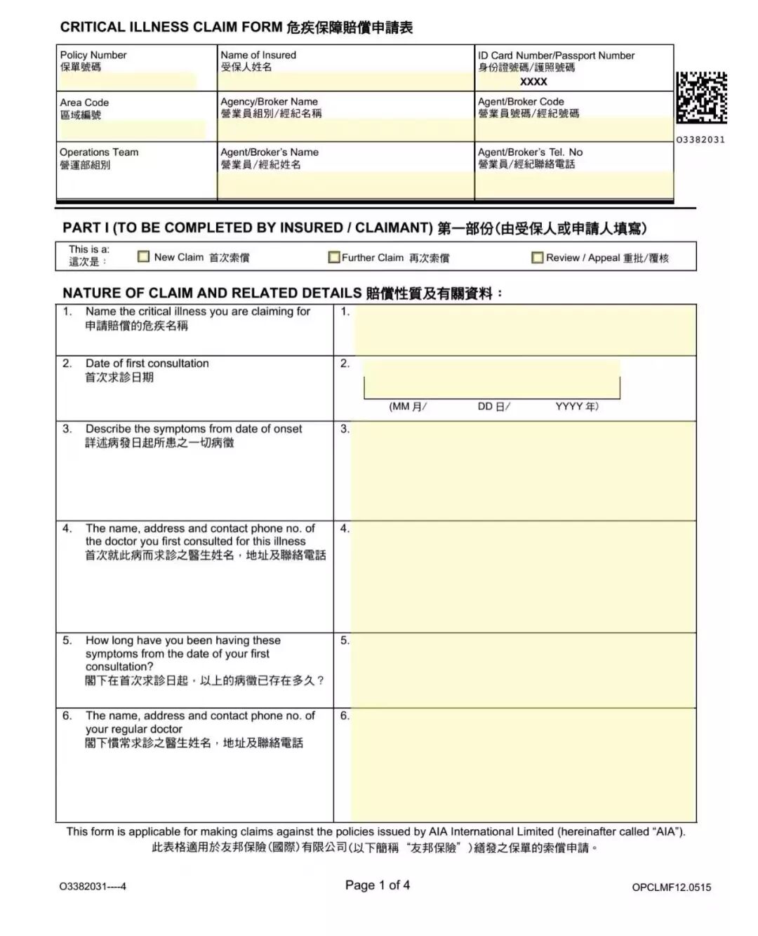 第一步:填写赔偿申请表格第一部分:《危疾保障赔偿申请表》
