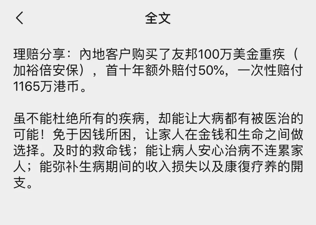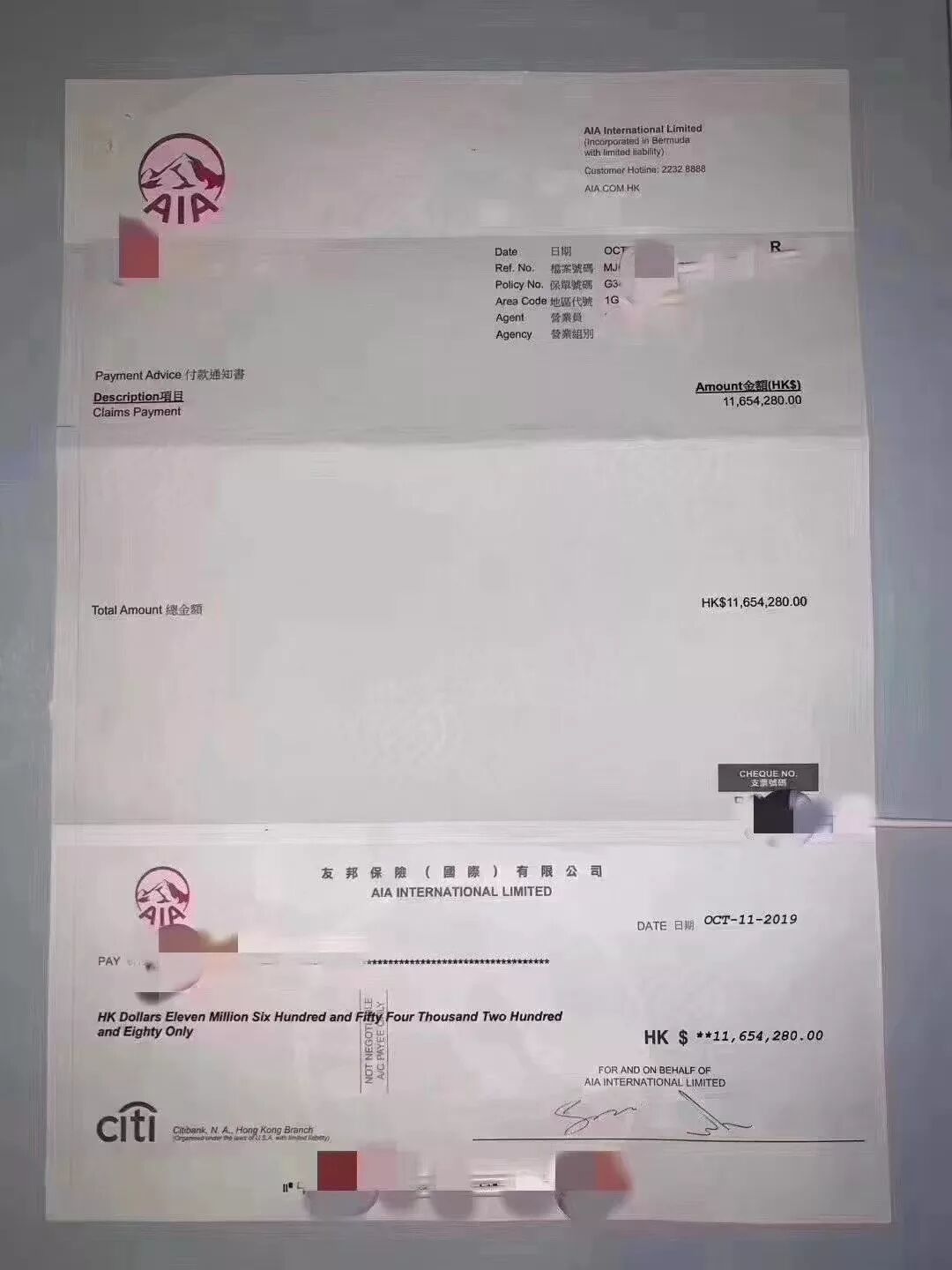 重疾买了100万美金保额,顺利承保了,买的是友邦AIA的老款重疾【加裕倍安保】,因为首十年赠送保额50%也就是50万美金,那么理赔就得到了150万美金之多了。