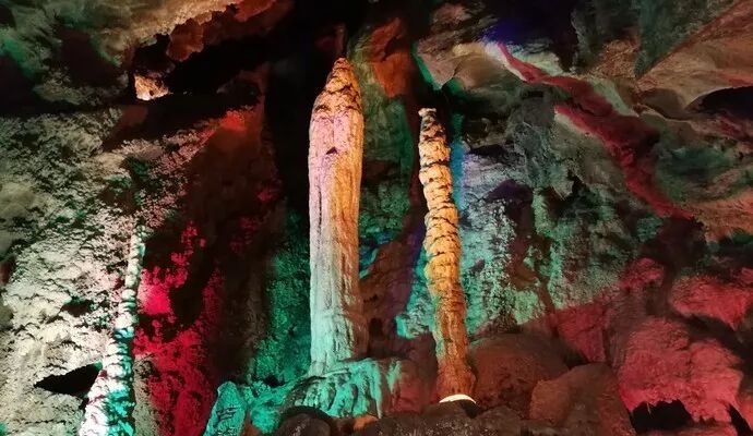 溶洞里有的就是小学课本讲过的石钟乳、石笋、卷曲石、单晶方解石花等,极具观赏和科学研究价值的景物。洞里曲折蜿蜒,光怪陆离,五彩斑斓,坐船穿行其中犹如遨游龙宫。