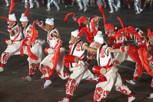 豪迈粗犷的动作变化,刚劲奔放的雄浑舞姿,充分体现着陕北高原民众憨厚朴实、悍勇威猛的个性与性格。安塞腰鼓可由上千人一同表演。