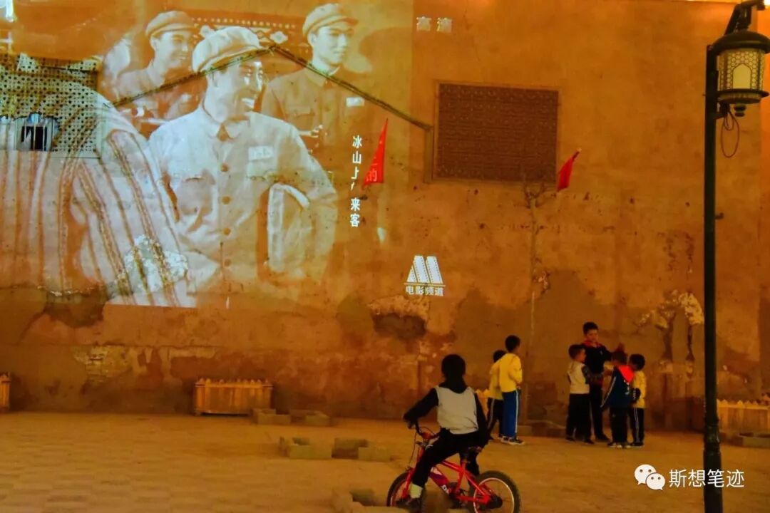 夜市的旁边有一个小广场,对面的红色泥墙上正在放着黑白老电影电影《冰山上的来客》。大人们在周围坐着,边聊天边看电影,孩子们就在广场中央骑自行车、玩滑板。有三个小男孩玩儿恼了,在推搡着准备打架,但一转眼的功夫,又凑到一块儿高兴的跑了。我也在那看了一会儿电影,还有在那里看电影的人们。