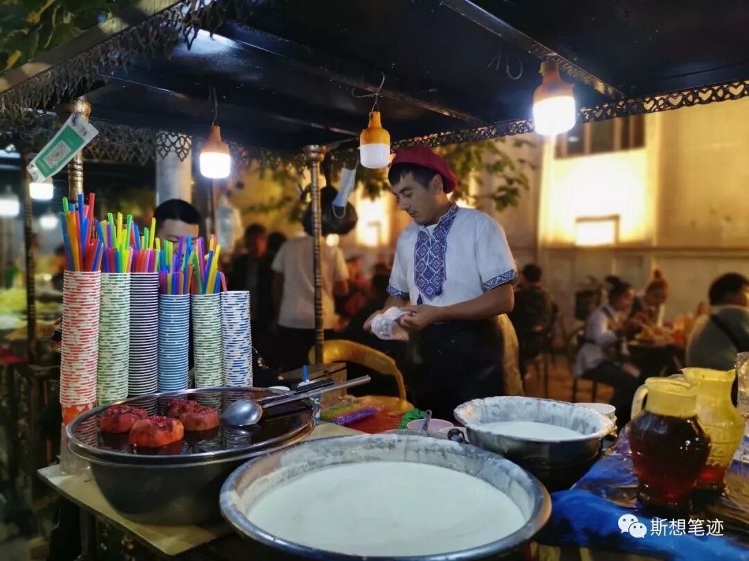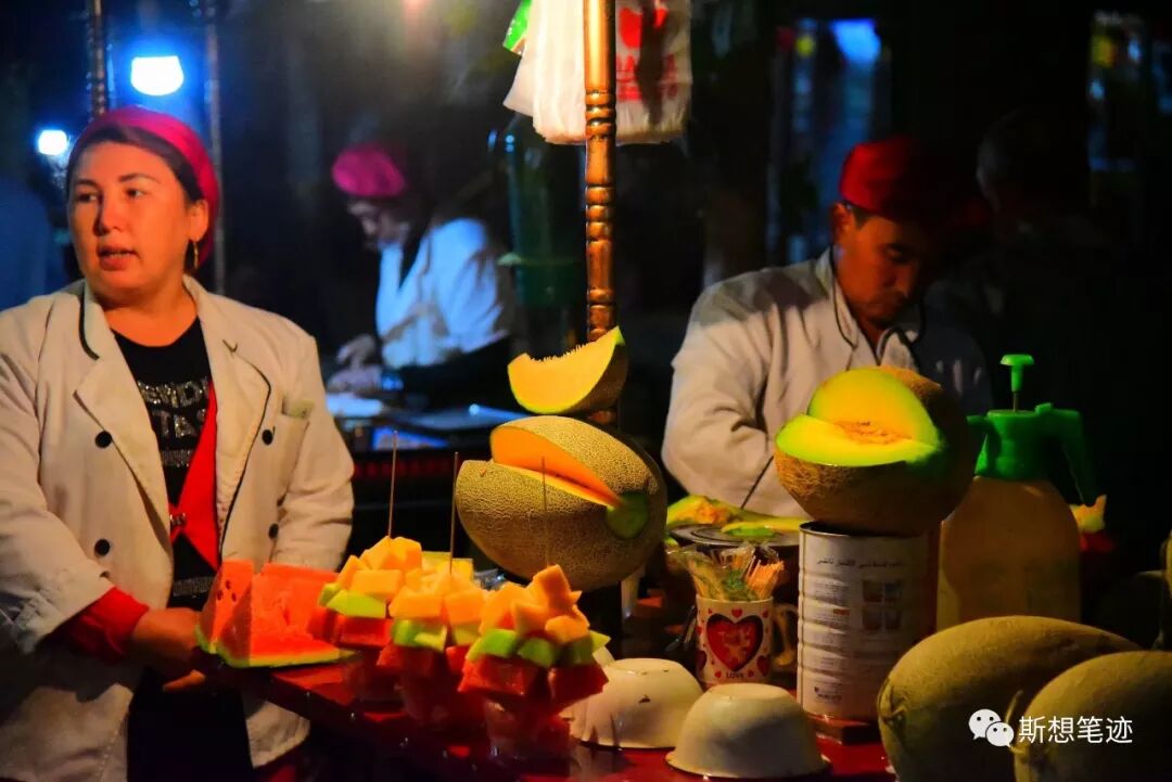 夜市上摊贩的老板,要比白天店铺里匠人老板更活泼,每个人的表情动作都非常生动,他们善于和经过的人互动。这让我想起一句形容维吾尔族人热爱经商的谚语:“如果一天没有生意,他们可以把左口袋里的东西卖给右口袋。”