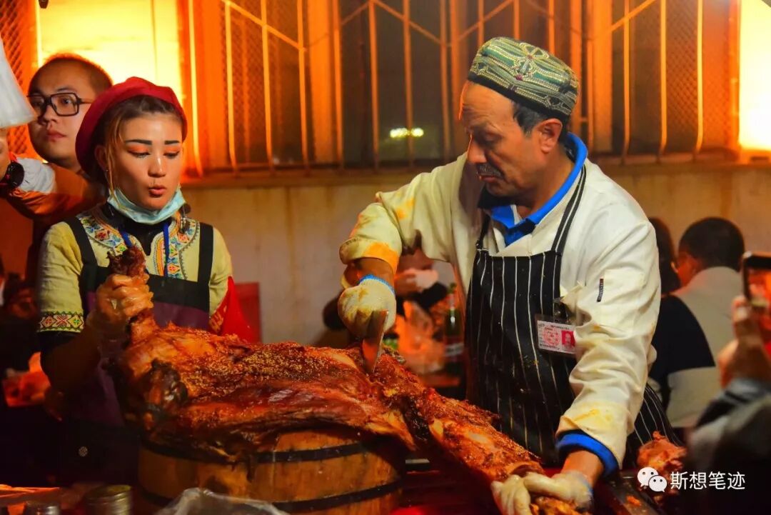 各种摊位好像是一下子从地下冒上来的似的,烤鱼、烤馕、烤南瓜、烤包子、烤一套蛋,烤一切;羊头、羊蹄、羊杂、羊肉,全羊,羊的一切;西瓜、哈密瓜、甜瓜、石榴、冰淇淋、酸奶,甜滋滋的一切。