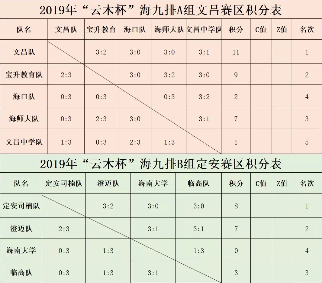 19日晚战况、A组文昌赛区:文昌3:0海口、海师大3:1文昌中学、宝升教育3:0海口;B组定安赛区:澄迈3:1海大、定安司楠3:0临高。