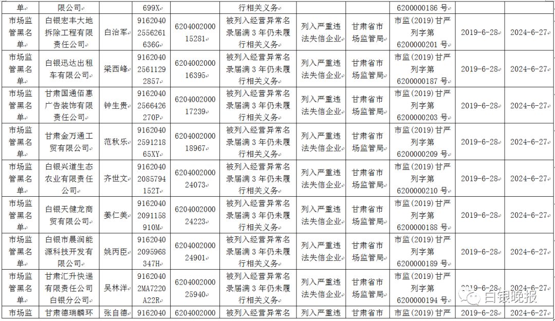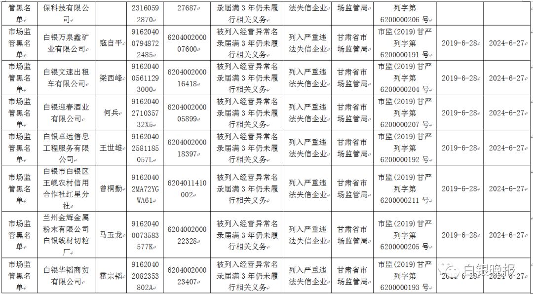 白银市市场监督管理局公布的失信“黑名单”有:甘肃车国汽车销售服务有限公司、白银宏晟伟业商贸有限公司等21家企业。白银市中级人民法院公布的失信被执行人“黑名单”有:白银阳明科技商贸有限公司、甘肃永辉教育科技股份有限公司等30家企业。