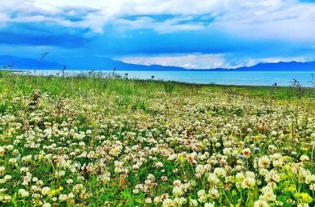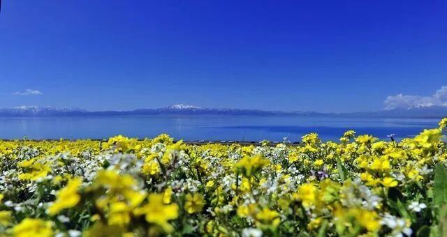 每年夏天,赛里木湖湖畔鲜花盛开,从远远的山脚一直铺展到湖边。