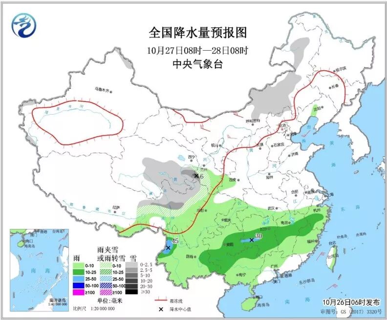 明天,内蒙古中东部、青海中东部、西藏东部、西北地区东南部、西南地区北部等地有小到中雪或雨夹雪,其中,甘肃南部等地部分地区有大雪(5~6毫米)。江汉南部、江南大部、西南地区大部、华南大部等地有小到中雨,其中,湖南西部、云南西部等地部分地区有大雨(25~45毫米)。