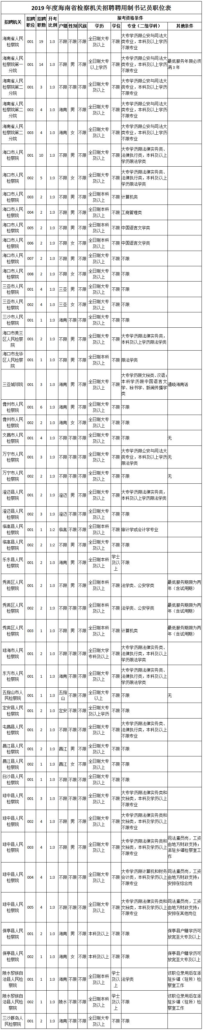 三、报考程序(一)职位查询招考职位、招考名额、报考资格条件等详见《2019年度海南省检察机关公开招聘聘用制书记员职位表》(以下简称《职位表》,见附件),报考人员可下载查阅。对《职位表》中的有关问题需要咨询时,请与海南省检察机关政工部门联系。(二)网上报名报考人员应在报名规定时间内登录海南省人民检察院官方网站“天涯正义网”(http://www.hi.jcy.gov.cn/),进入“聘用制书记员网上报名管理系统”(http://sjy.i35.cn/index.php)(以下简称“报名管理系统”)进行网上报名。本次考试不收取报名费。报名时间:2019年10月28日8:00至11月3日16:00。网上报名按以下程序进行:1.提交报考申请。报考人员应在报名期间登录报名管理系统进行注册,填写、提交报考申请,并同时上传身份证正反面、毕业证、学位证、学信网证明和本人近期正面免冠蓝底证件照片,有户籍限制岗位需上传户口本本人页照片(图片上传要求:以上材料都以jpg图片格式上传,图片大小20-200KB)。报考人员只能选择一个职位进行报名。报名必须使用有效期内的二代身份证,报名与考试时使用的身份证必须一致。报考人员属2019年应届毕业生的,如尚未取得毕业证书,可上传贴有本人照片并加盖院校系公章的证明。2.本次考试实行诚信报名。报考人员要仔细阅读诚信承诺书、招考公告等,根据个人情况报考符合条件的职位,并按要求真实、全面、准确填写相关信息。报考人员提供虚假报考材料的,一经查实,即取消报考资格。对伪造、变造有关证件、材料、信息,骗取考试资格的,将按照有关规定处理。3.查询资格审查结果。检察机关依据公告的招聘条件对报考人员进行资格审查。已经提交报名材料的考生,须在2019年11月3日12:00前及时登录报名系统查询资格审查结果,资格审核通过的,不得改报或再报其他职位。资格审核未通过的请及时补充材料重新提交或改报,如果在规定时间内资格审核仍未通过的,不能参加考试。网上报名系统2019年11月3日12:00后不再接受考生注册报名,11月3日16:00准时关闭。4.职位核减:报考人员达不到开考比例的职位,将核减相应的招聘人数或职位,已报考被核减职位的考生,根据通知可改报其他岗位。5.打印准考证。打印准考证时间和笔试、技能测试时间同时公布。