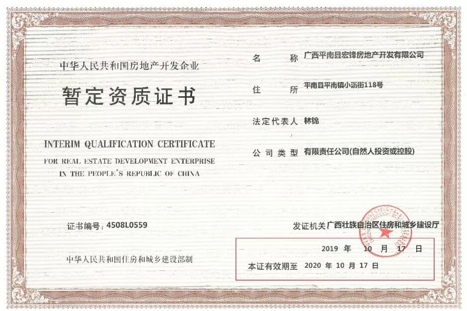 2019年10月17日住建厅颁发广西平南县宏锋房地产开发有限公司房地产企业暂定资质证书,在此感谢平南县房管所、平南县住建局、贵港市住建局、广西住建厅对破产行业的大力支持。