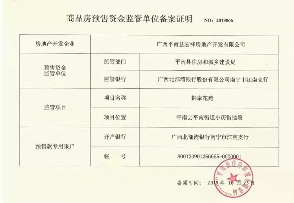 2019年10月23日,平南县住建局、北部湾银行南宁市江南支行、宏锋公司在住建局签订商品房预售资金监管协议,同天进行商品房预售资金监管单位备案证明。自2019年10月23日开始锦泰花苑商品房预售受到平南县住建局的监管,同时监督锦泰花苑竣工验收。